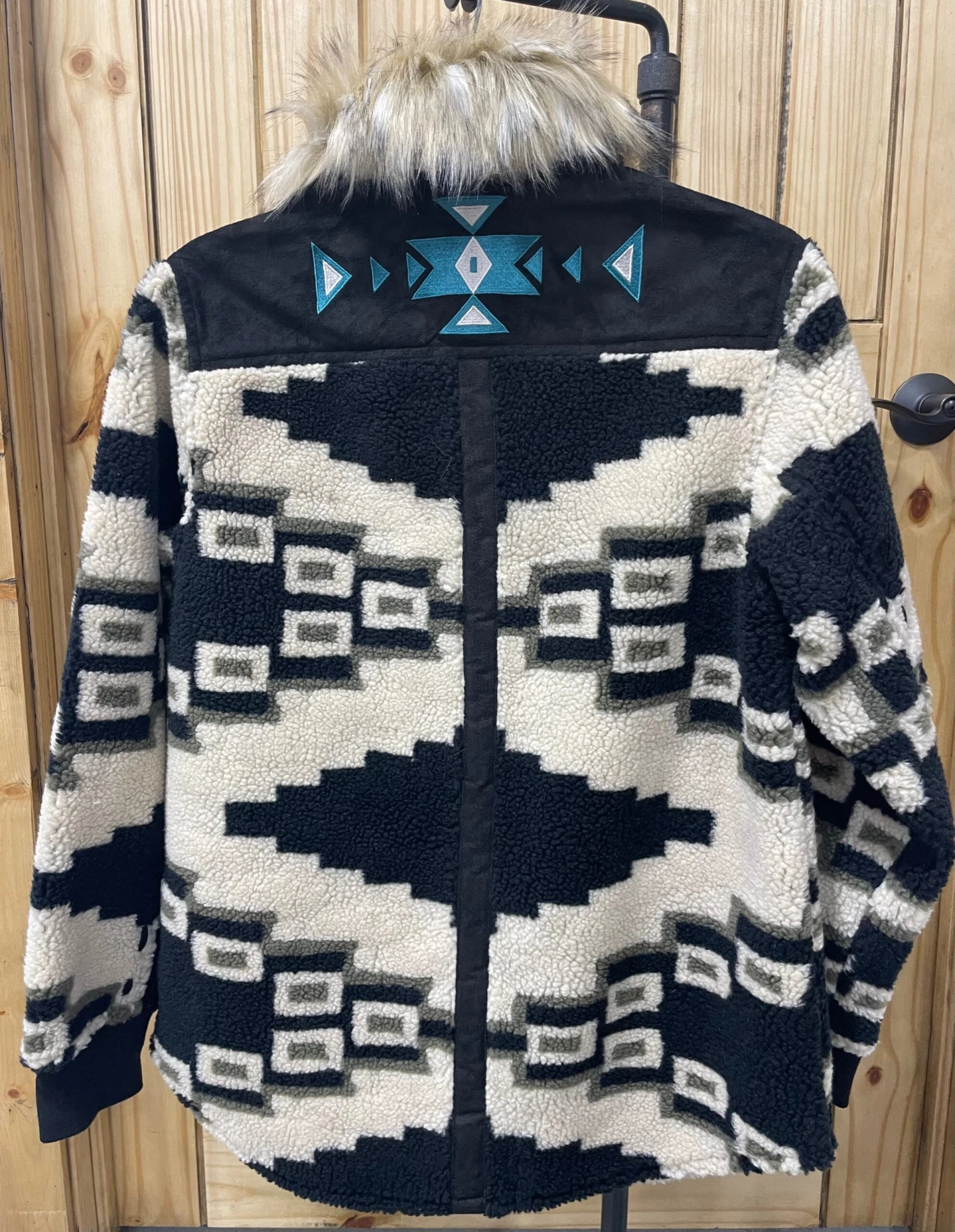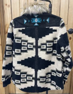 Bundle up in style! The Avalanche Jacket by Tasha Polizzi is going to keep you warm and toasty all fall/winter! Super soft, fuzzy and comfy! The faux fur collar can easily be unbuttoned and removed for a different look. Snap front closure, cuffed wrists, pocket left chest, suede to back with turquoise and silver design. We can’t love this enough!!