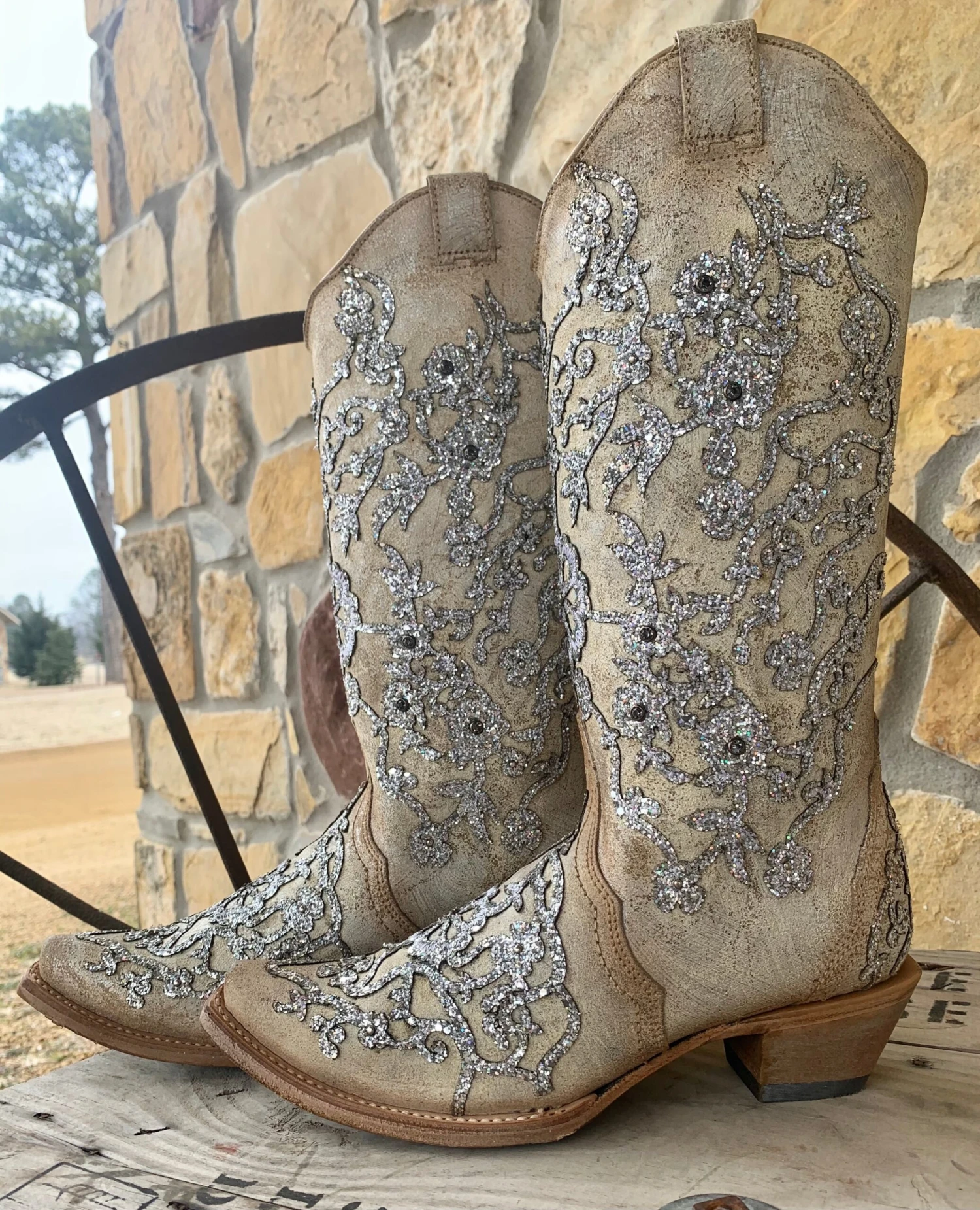 There will never be a reason to cry while wearing these Flower Happy Boots by Corral. These boots are a vintage cream underlay with silver glitter flowers and studs throughout.