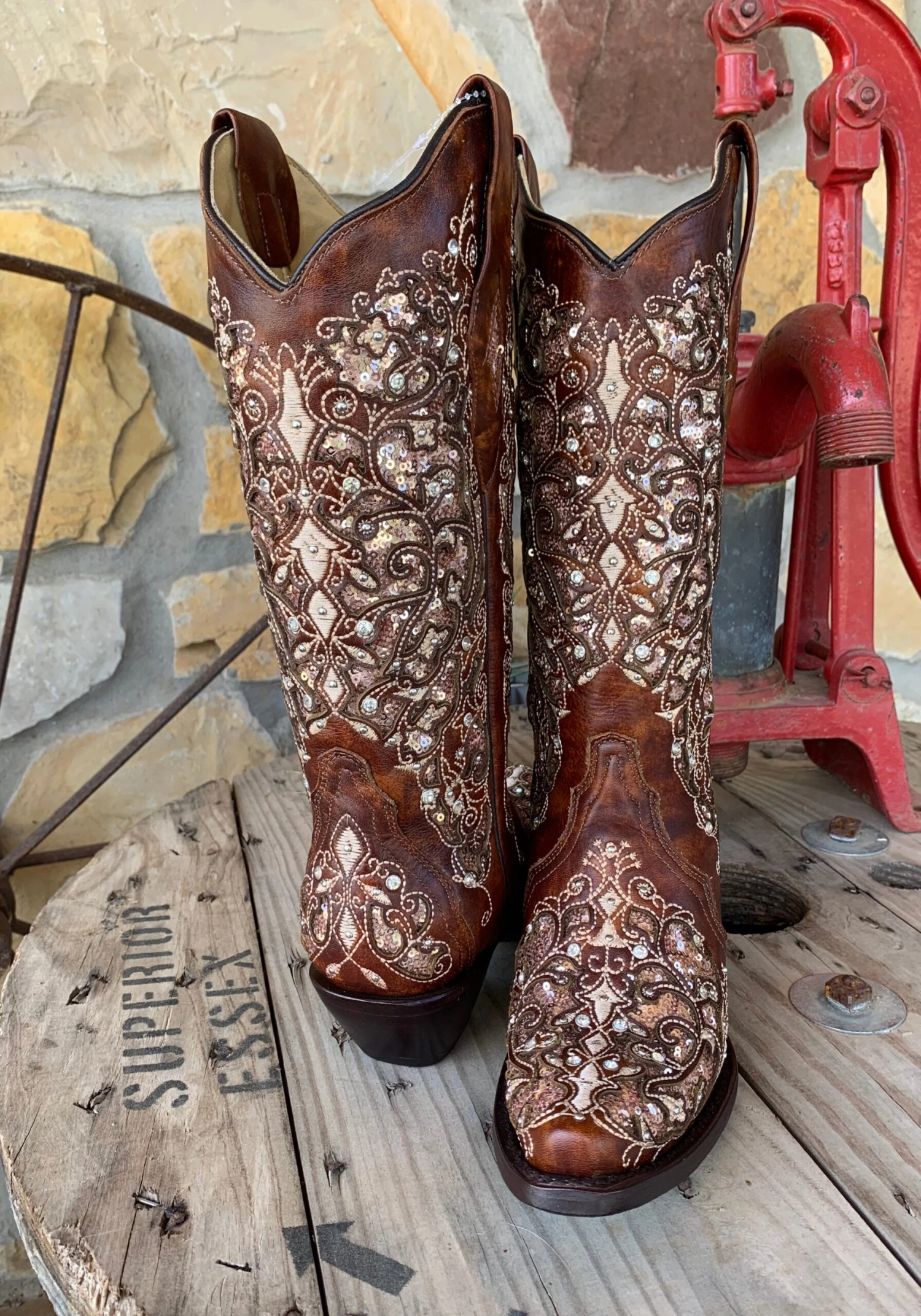 Corral saddle brown boots with rose gold glitter inlay! These boots are perfect for weddings, night out on the town, or just your every day wear!