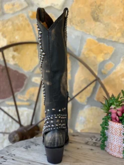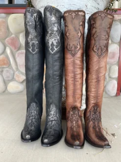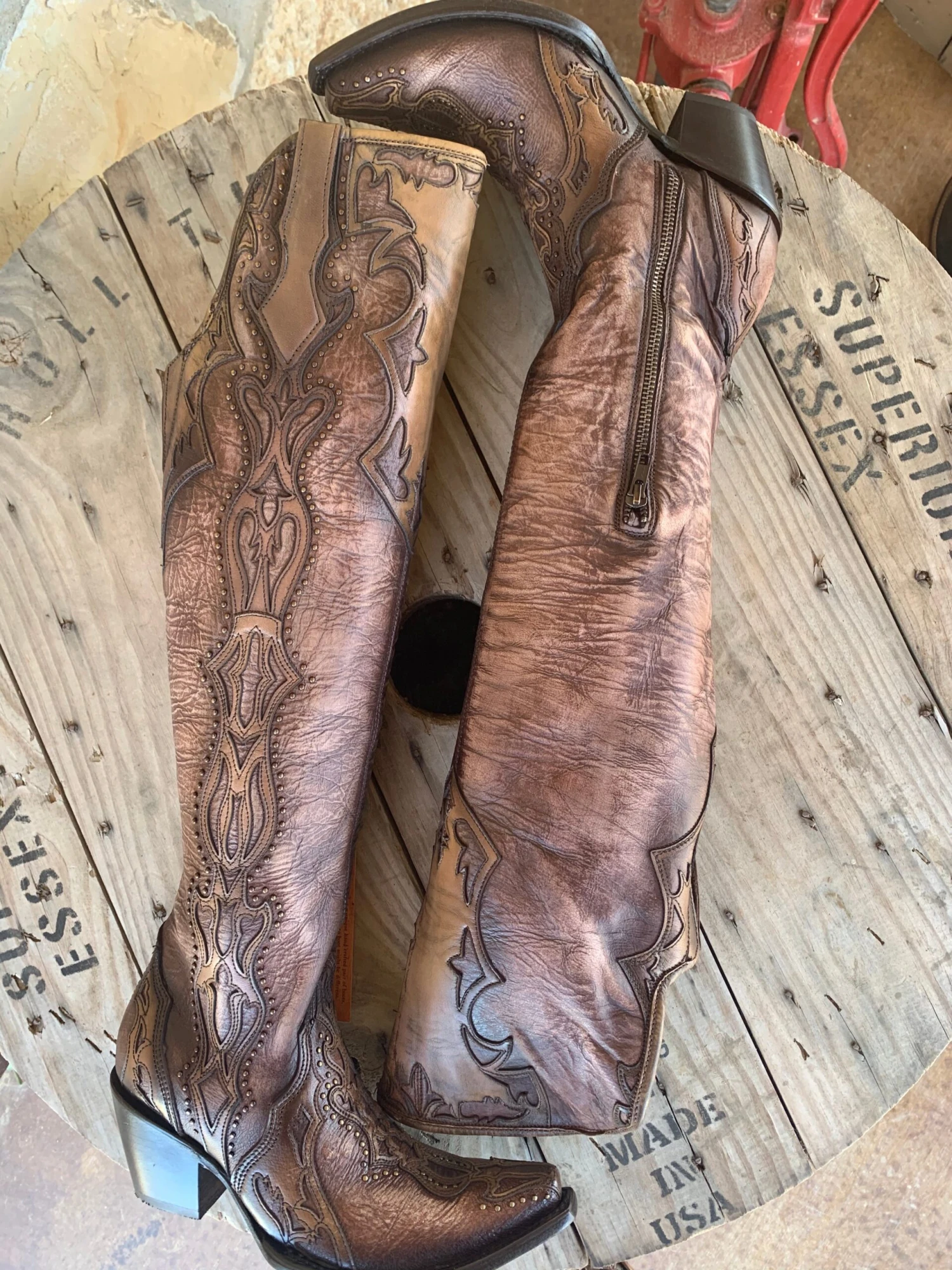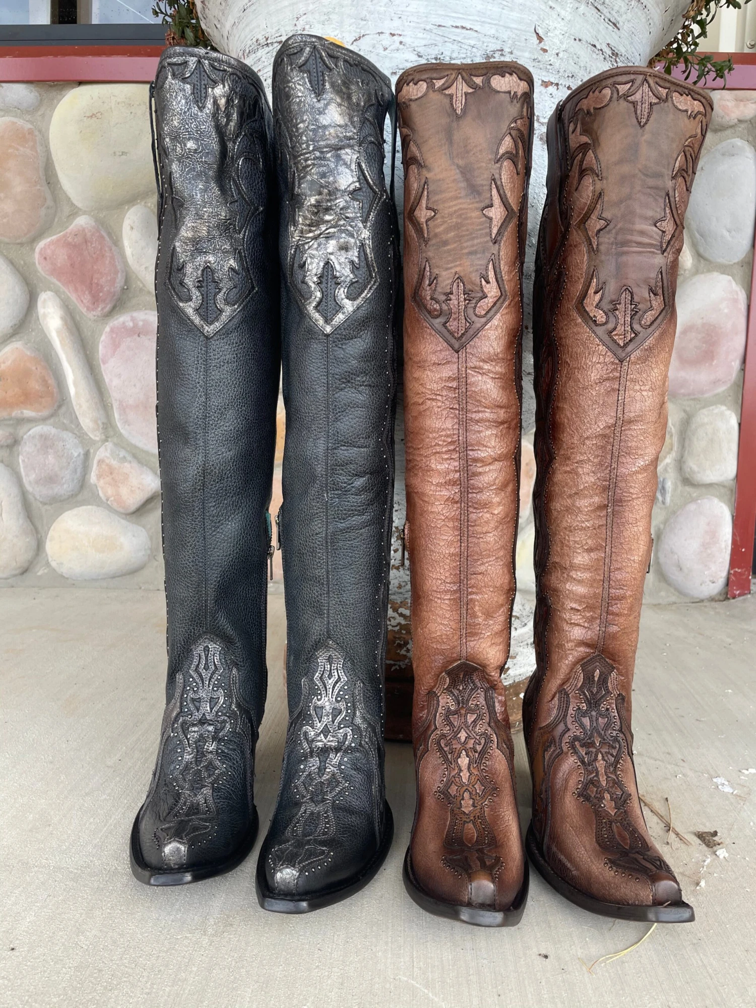 This boot gives us major Wonderwoman vibes! This tall boot by Corral is a beautiful vintage brown leather with embroidery detailing and gold metal studs. They are so versatile and could be worn with just about anything!