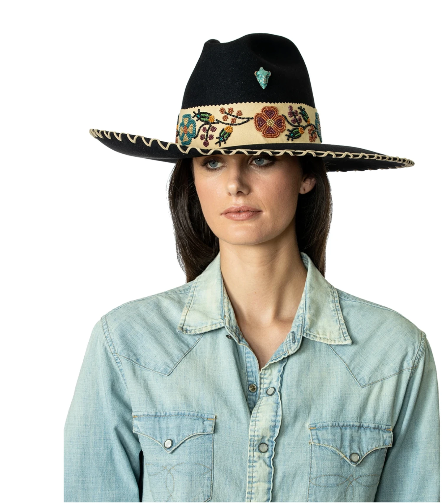 - embellishment: buffalo pin, hand-beaded suede band, contrast cross-whip stitch cording around brim