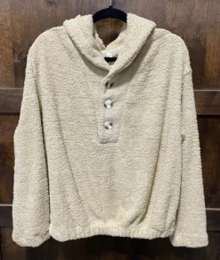 The perfect pull-over just arrived! This taupe colored, soft and cozy pull over is ooohhh sooo warm and toasty! Features and elastic waist, collar(no hood) and large buttons to front! Pair this with your favorite leggings, beanie and just like that…your are winter ready!