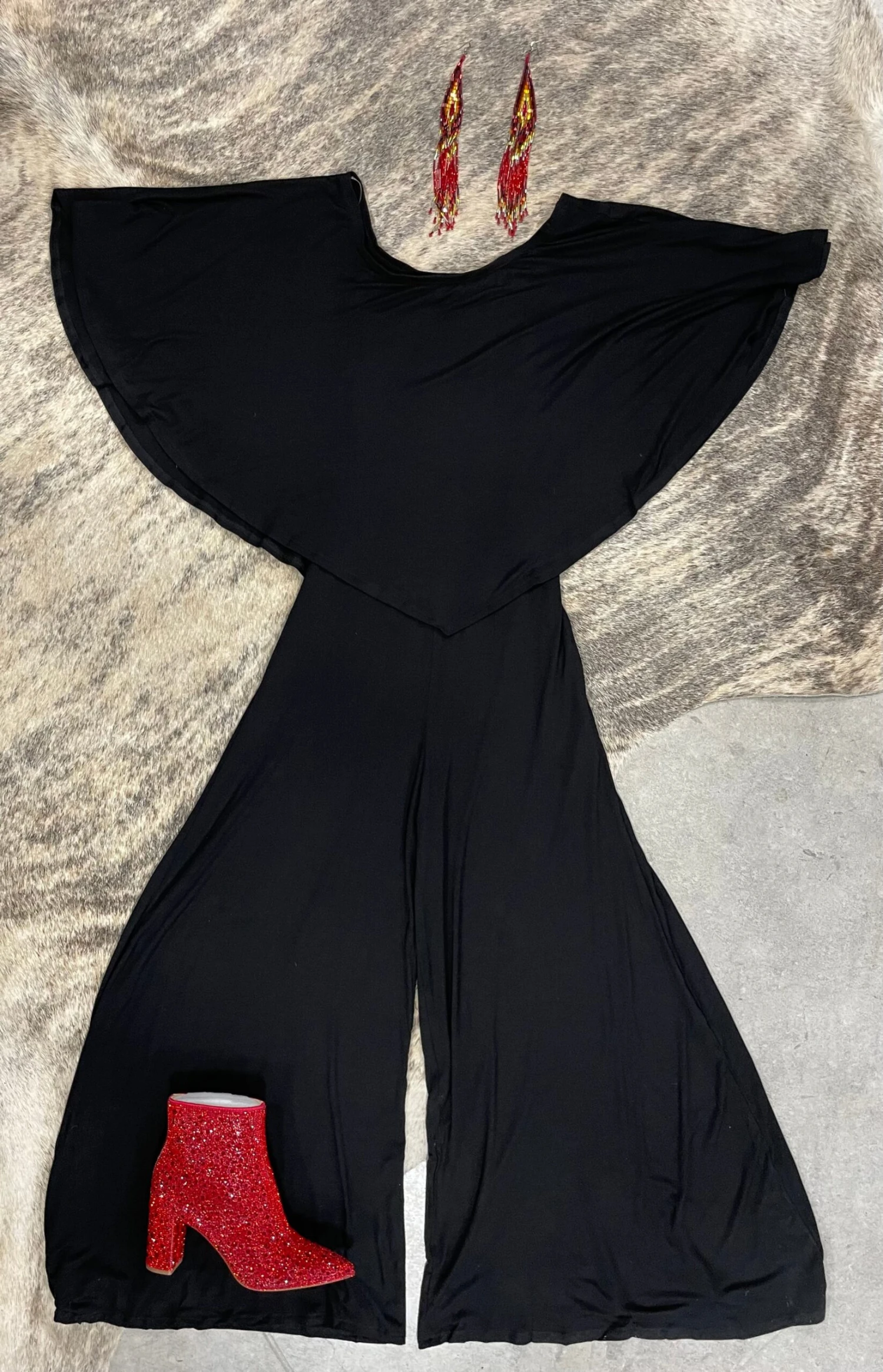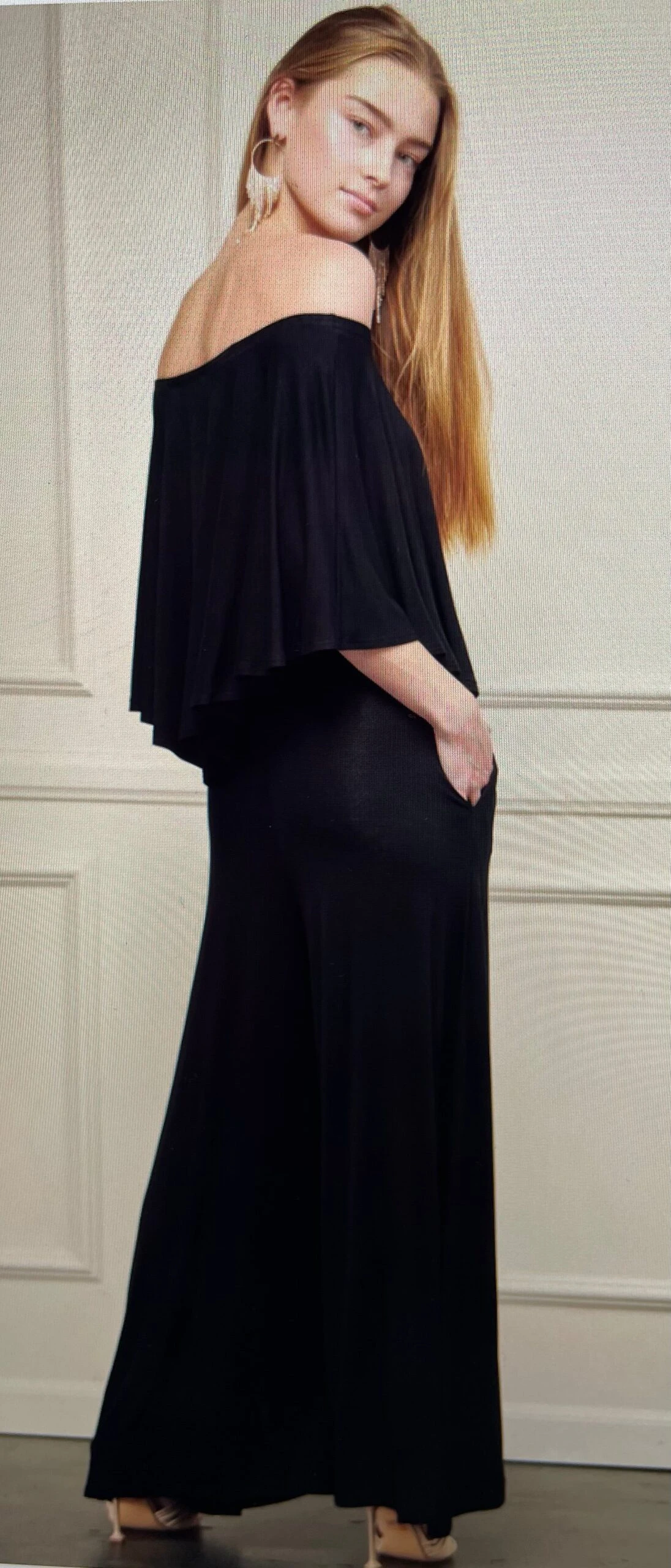We are so in love with our new off shoulder jumpsuit. Super comfy and stretchy. This sexy jumpsuit features a large V ruffle to from and back, pockets and is wide leg. Can be worn exposing both shoulders or just one.