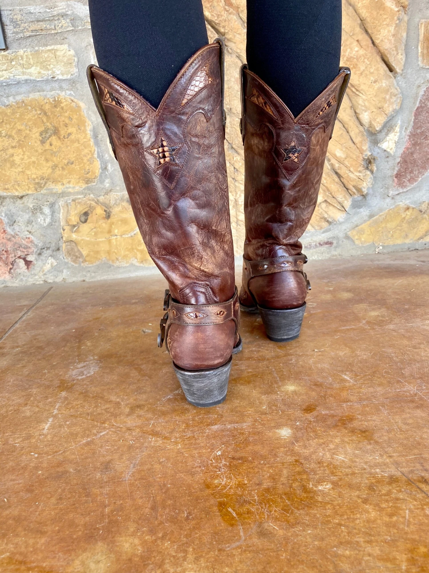 This stunning brass boot with metal embellishments is amazing! These boots are ready to walk the line!
