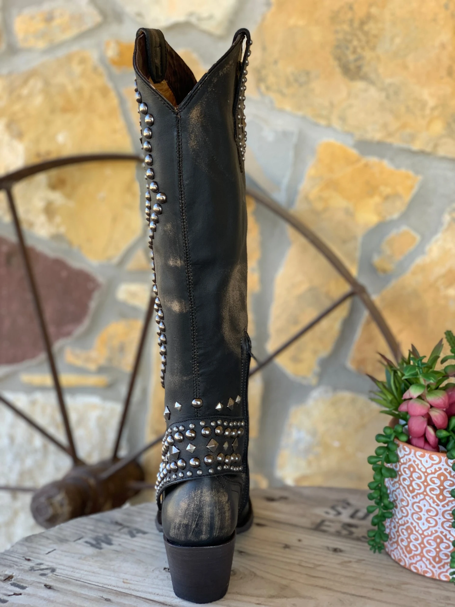 Rockeresque studded style that resides somewhere in between Fashion Forward and Western Glam Styling. Beige based black leather is heavily distressed and only looks better which age and wear.