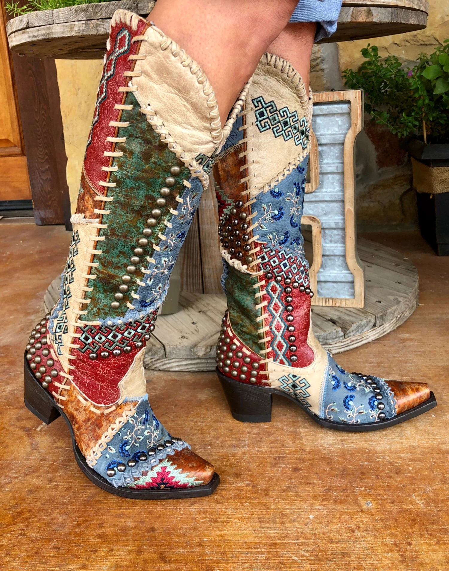 I have no words for this Amazing Boot!!! This patchwork beauty is accented with silver and gold brads with some whip stitching.