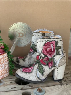 Whimsical floral patchwork with frayed finish gives this boot an ultra-rugged look. Distressed white leather with dusty rose overlay adds to that ruggedness. The stud detailing on the heels gives it an extra oomph.