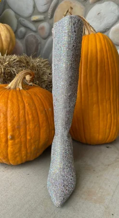 Tall boots with iridescent rhinestones that vary in size