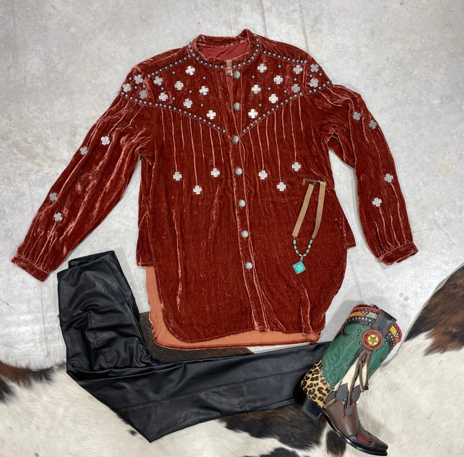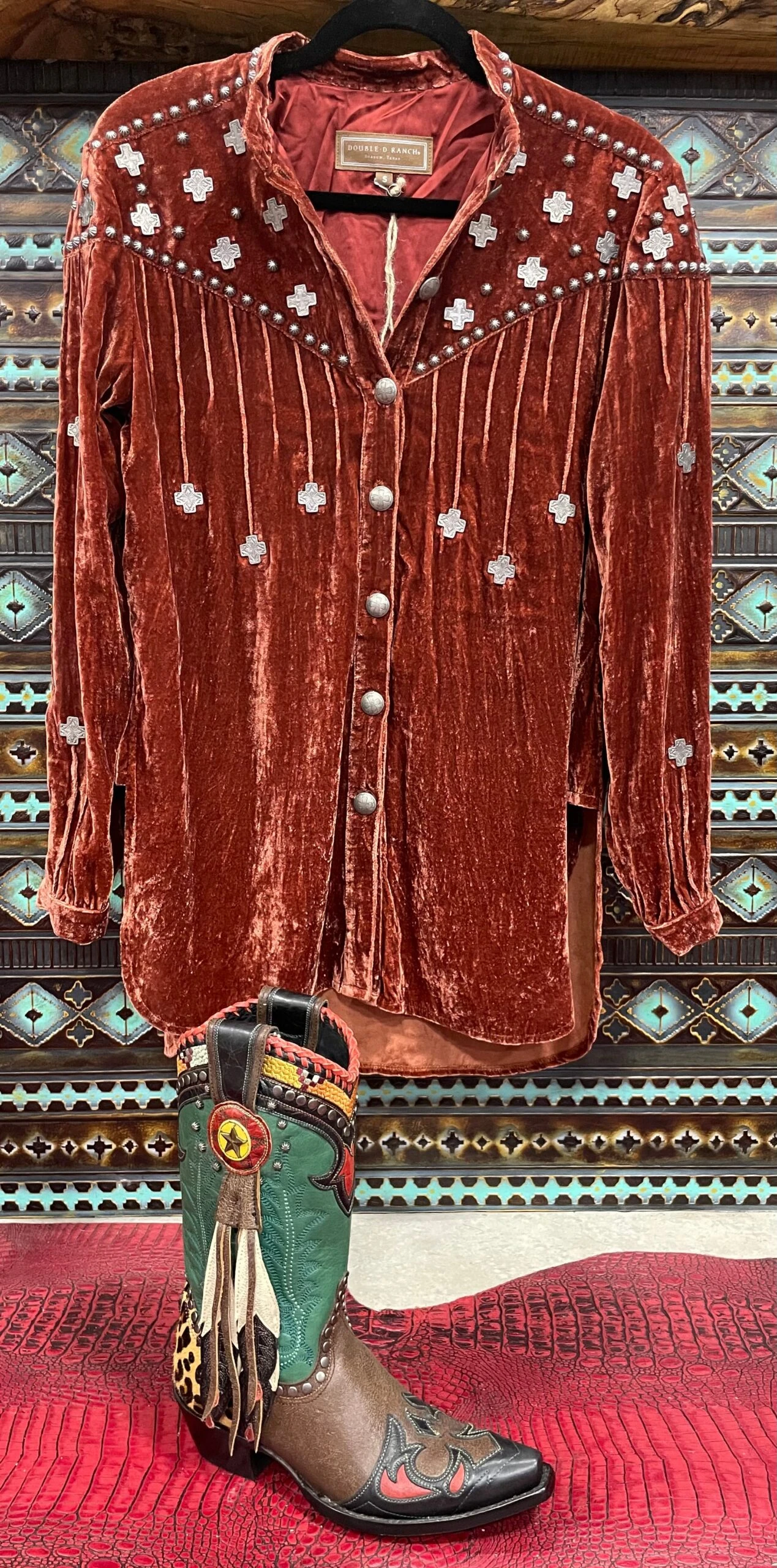 We love Double D! Our rust colored velvet blouse is so soft, roomy and comfortable. Check out the all gorgeous sliver crosses and brads to front, backĀ and sleeves! Button up, mock collar, side slits and a bit longer in the back. Ā Ladies, this is so beautiful!
