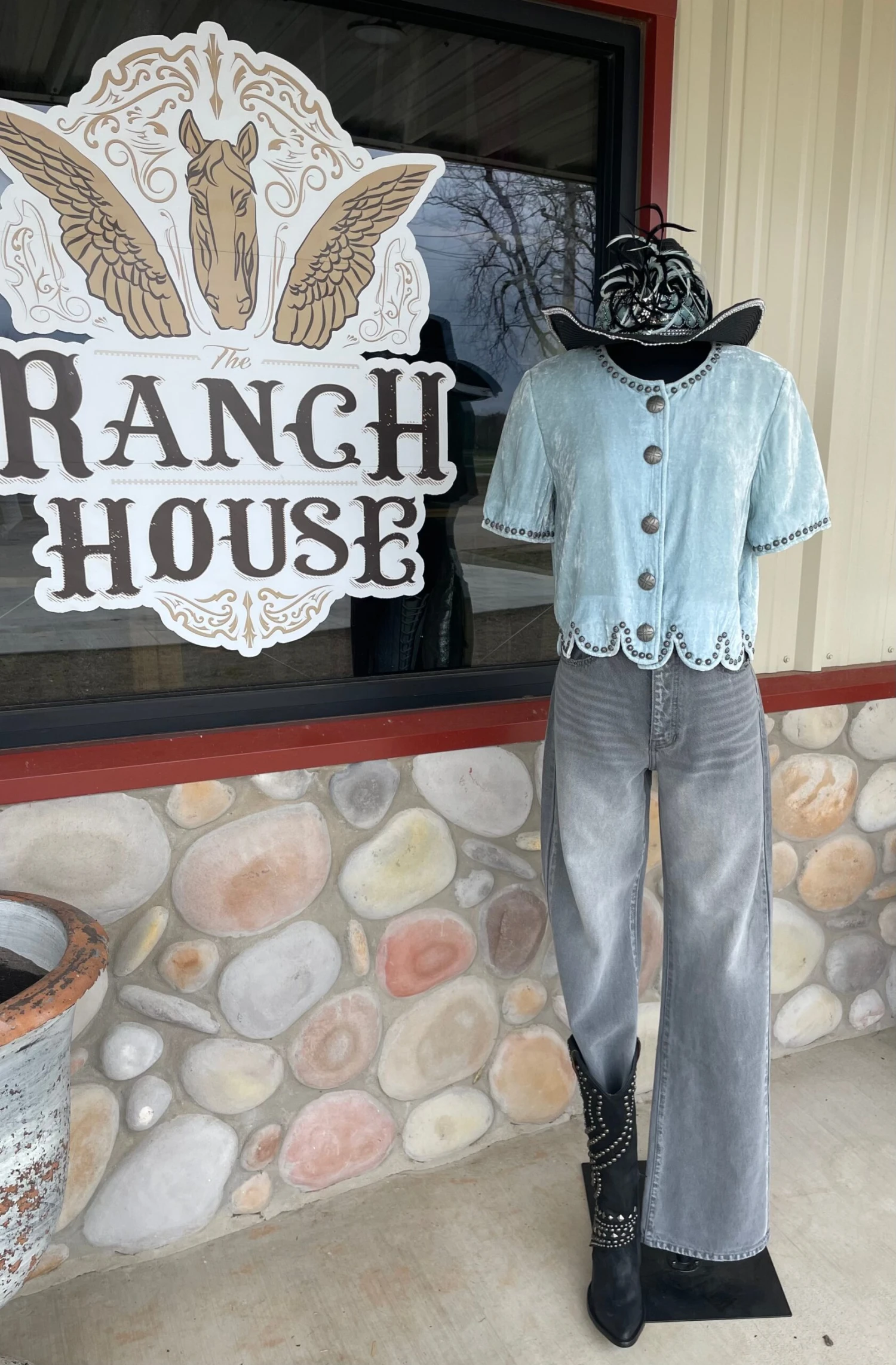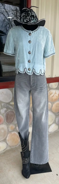 The Santa Fe Velvet Short ShirtĀ by Double DĀ is a DIME PIECE!! So velvety soft and comfy. ThisĀ waist length,Ā Baby Blue beauty features Antique Silver buttons and studs to round neckline, scalloped hem and front closure. Absolutely GORGEOUS!!