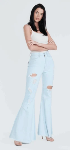 Take a trip back to the 70’s in these amazing bell bottoms. They feature a super light wash with camel stitching, complete with the perfect amount of distress. Super stretchy and fit is true to size.