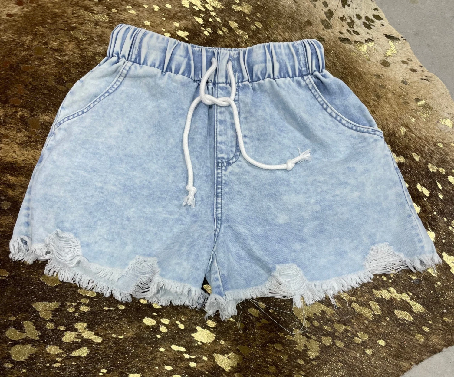 Hey, Babe! Ready for summertime? Let’s get those lake days started in these adorable denim shorts! How comfy with the elastic drawstring waist!! 2 deep pockets to front, 2 back pockets, distressed hem, light washed denim!