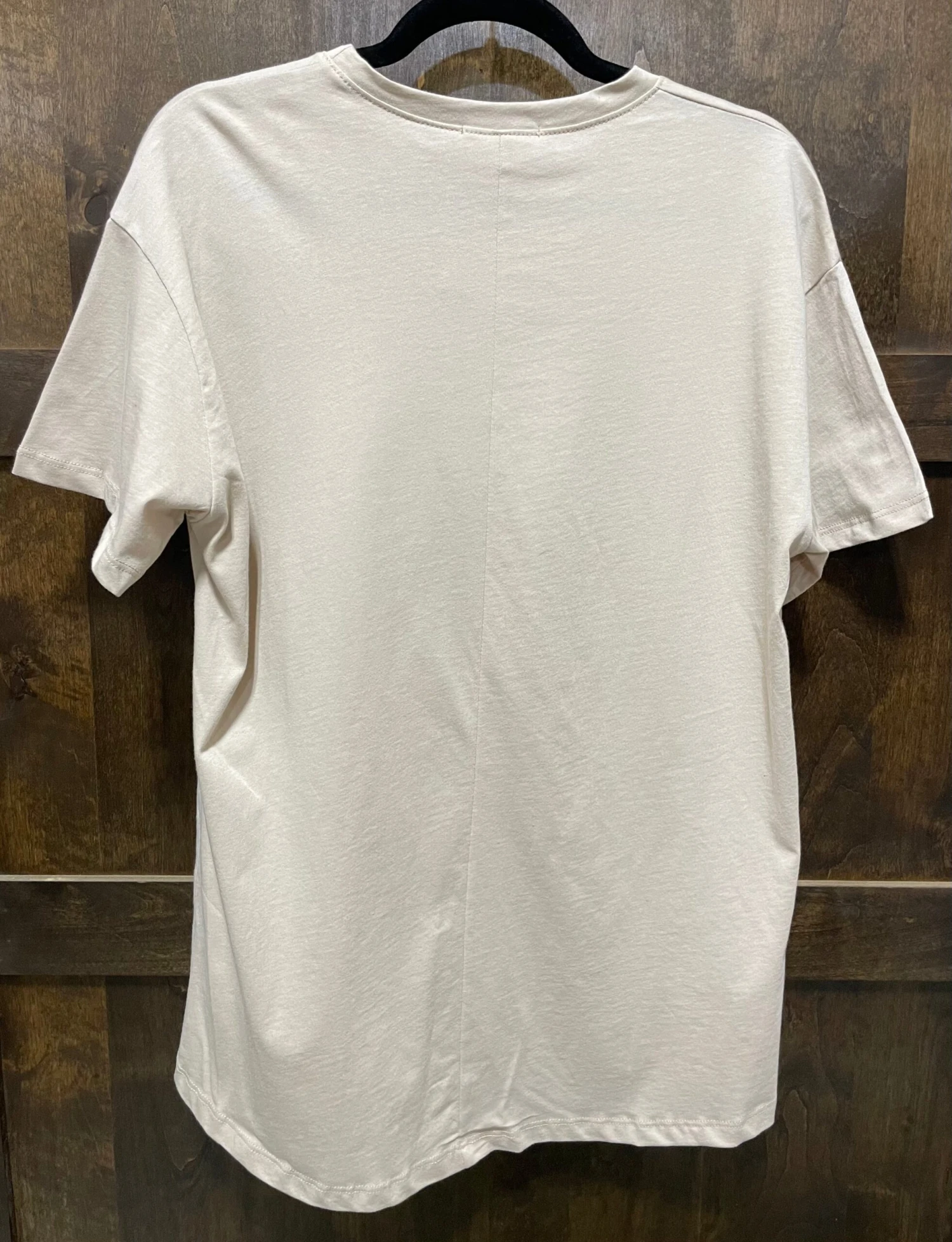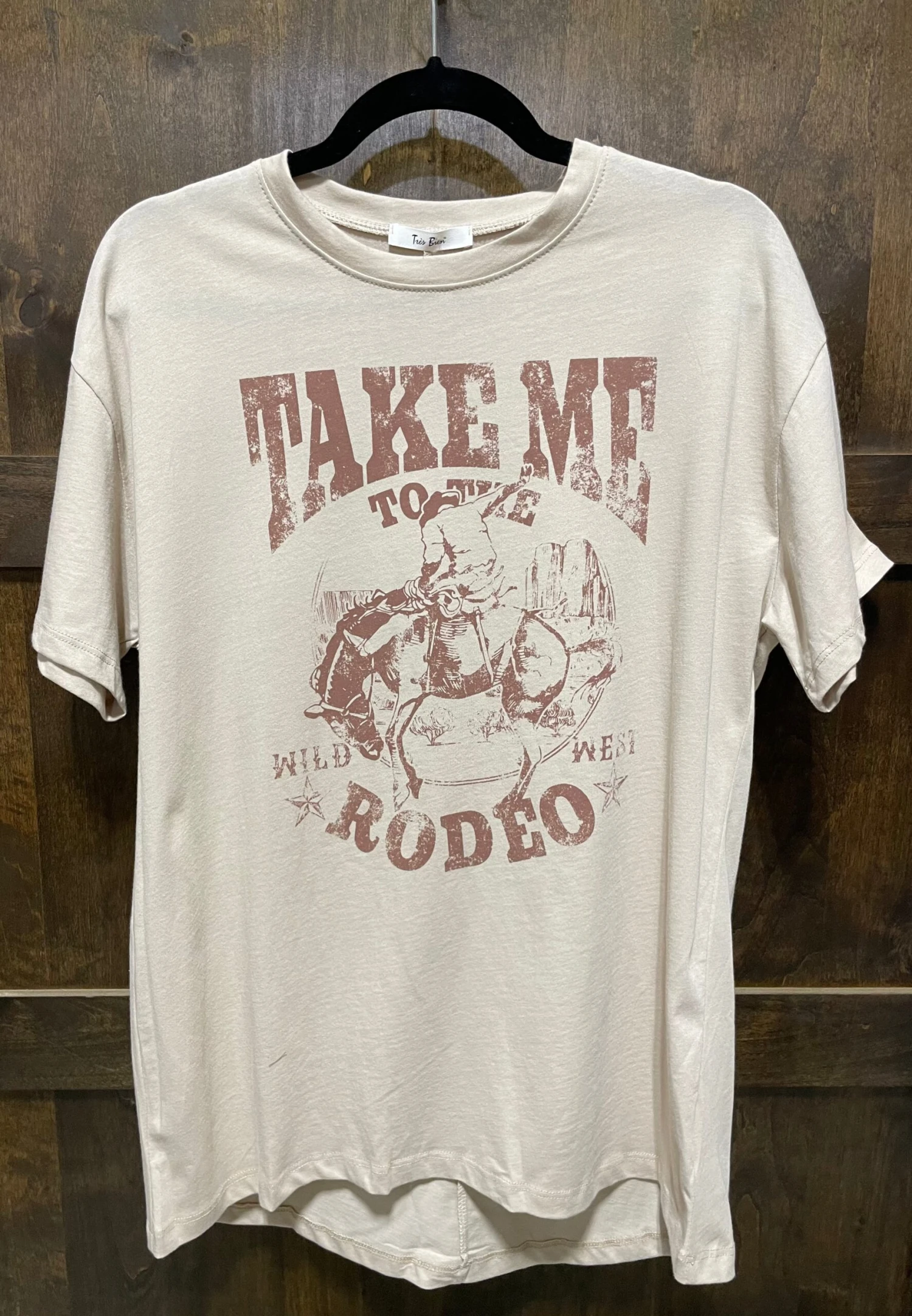 We are crazy about our new “Take Me To The Rodeo” graphic tee. This super oversized tee is lightweight, soft, room and cozy. The back of tee features a vertical seam and a longer tail. Cuteness overload!