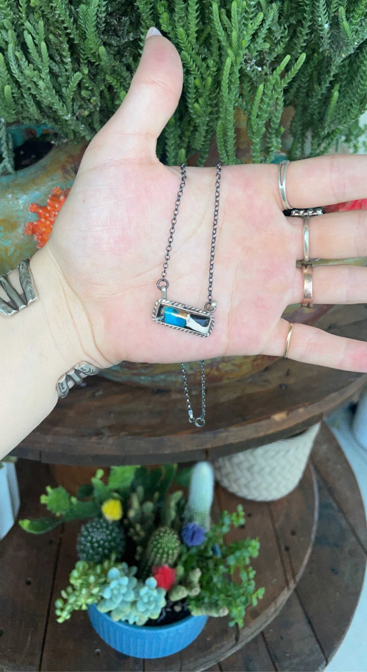 This stunning white buffalo turquoise and silver neckless is hand made with sterling silver by Robert Shakey with Navajo Kingman Turquoise. The chain is 16″ inches. This is pair well with many stacker neckless or outfit! The butterfly meassures 1″ wide, and 1/5″ tall.